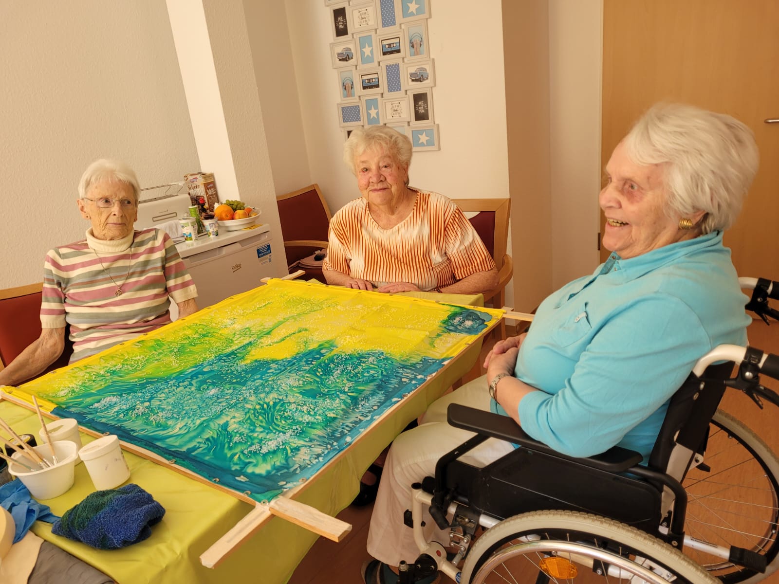 Unser Sozialer Dienst hat hierzu ein Angebot entwickelt, um über die aktuellen Geschehnisse ins Gespräch zu kommen. In dieser Runde wurde, auch als Hilfe zur Verarbeitung, ein Seidenbild in den Farben Blau und Gelb erstellt und die Aussagen der Bewohner*innen wurden schriftlich festgehalten. Der Wunsch der Bewohner*innen war, dass diese Dokumentation der Anteilnahme und Solidarität mit den Menschen aus der Ukraine sichtbar wird.