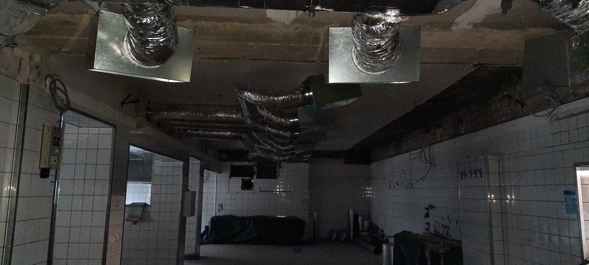 Die Leitungen der Lüftung in der Küchendecke sind bereits installiert. Es folgt nun die Elektroinstallation, der Einbau der Brandschutzvorrichtungen sowie die Erstellung der neuen Decke.