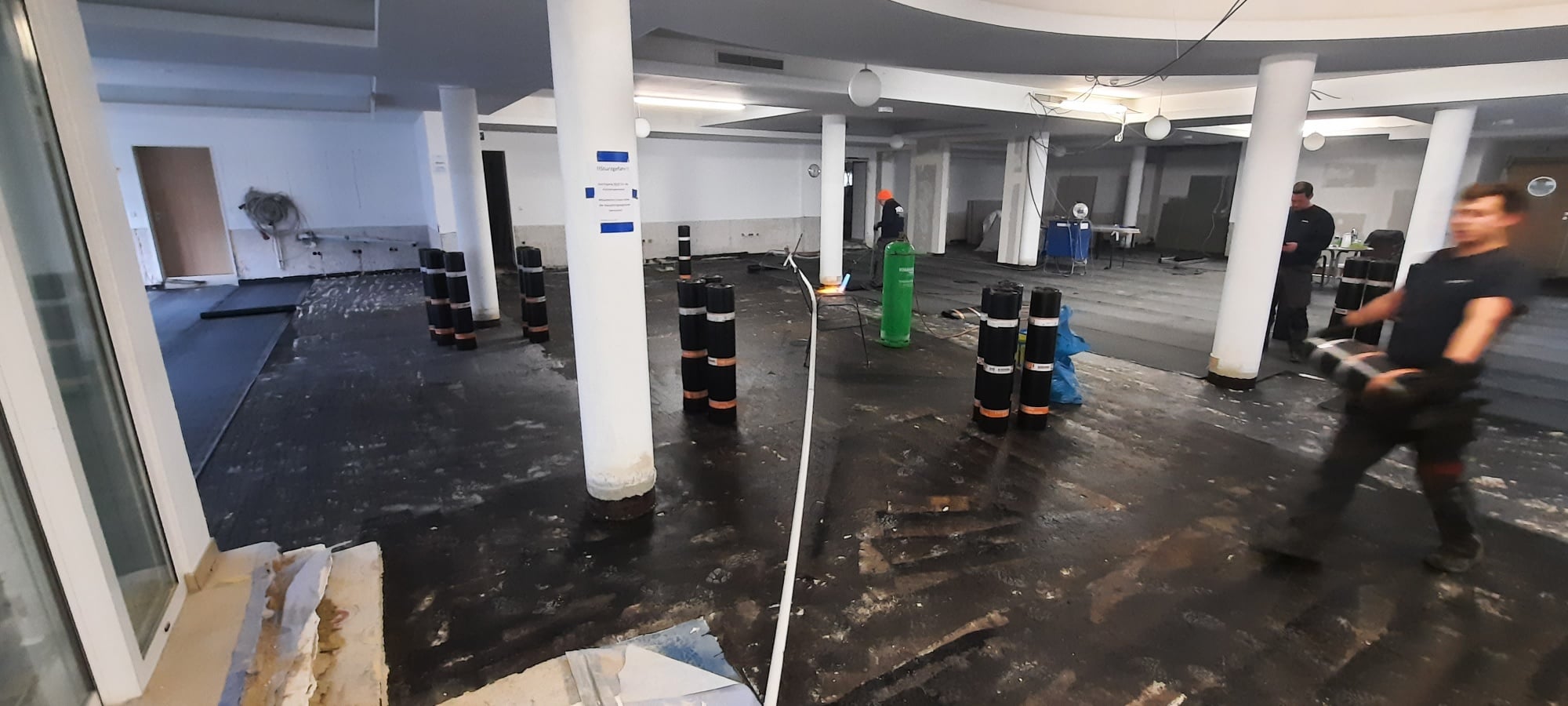 Im Speisesaal wird eine Bitumen-Schweißbahn zur Abdichtung eingebracht. Bis der Speisesaal allerdings wieder zur Verfügung steht, wird es noch ein bisschen dauern. Hier muss zunächst eine neue Elektroplanung erstellt werden, weil die alte im (Keller-)Archiv der Sülz anheim gefallen ist und nicht digital vorlag.
