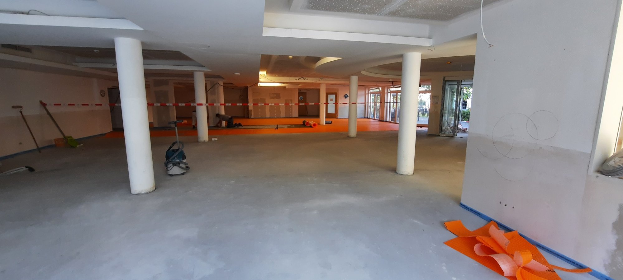 Im Restaurant und der Cafeteria wird das Verlegen der Fliesen vorbereitet. Laut Bauzeitenplan wird das Erdgeschoss von Haus Pauline (inkl. Veranstaltungssaal, Friseur und Empfang) Anfang November saniert sein.