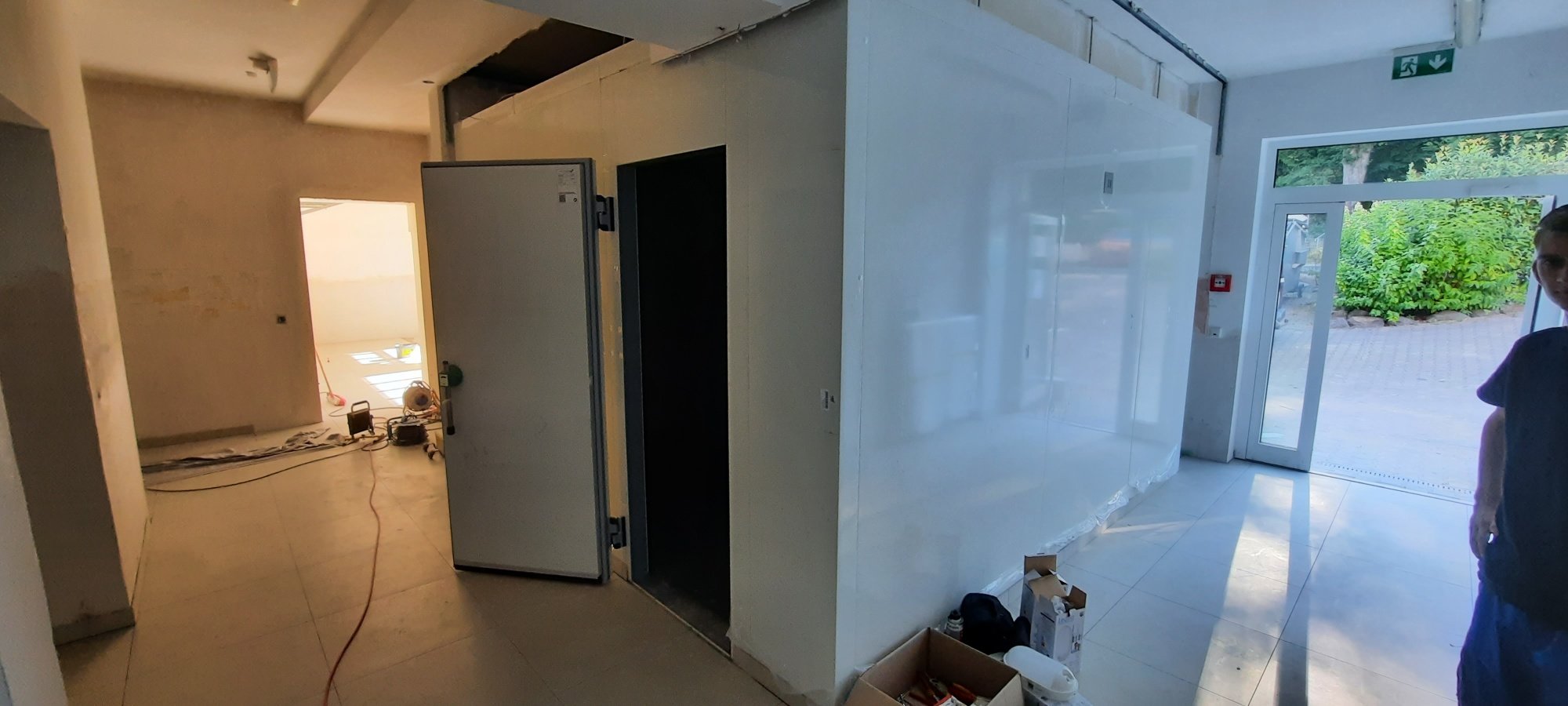 Die Kühl- und Gefrierhäuser sind bereits eingebaut und funktionieren. In den Funktionsräumen werden zurzeit die Fliesen verlegt. Laut Bauzeitenplan ist die Küche Mitte Oktober fertiggestellt.