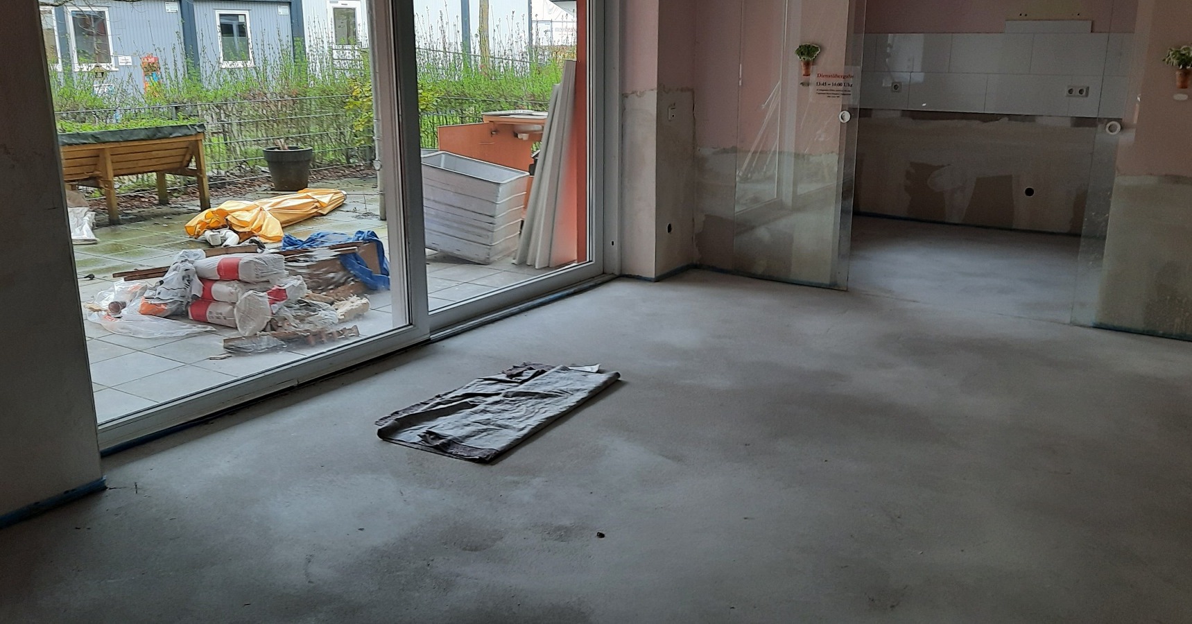 Haus Friedrich EG: Die Estricharbeiten sind abgeschlossen. Auch die Heizungen wurden installiert und laufen bereits. Zur Zeit werden die Badezimmer gefliest und zeitnah beginnen die Bodenleger ihr Werk. Die Wiederinbetriebnahme ist für Juni geplant.