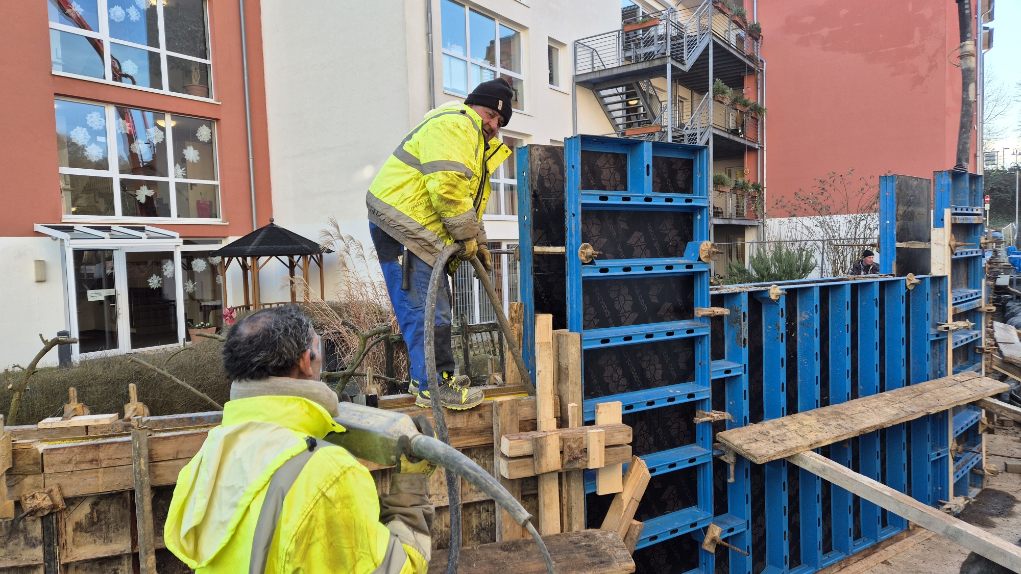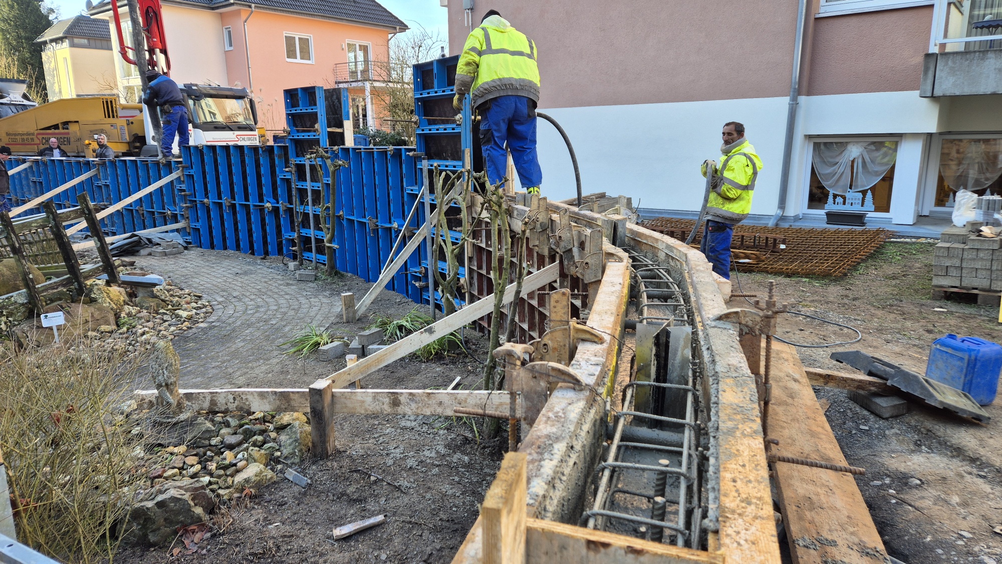 Der Bau der Hochwasserschutzmauer schreitet trotz der aktuellen Kälte gut voran.