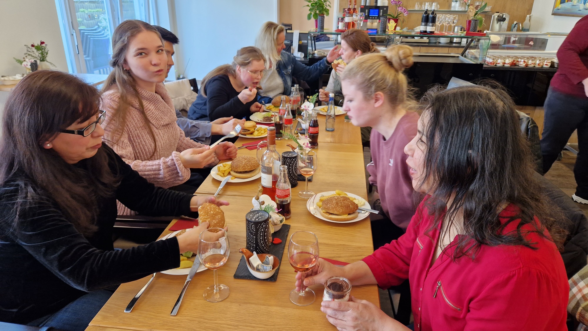 Um dennoch eine Verbundenheit mit unserer Einrichtung zu schaffen, werden regelmäßige Schüler-Cafés veranstaltet, bei denen unsere Azubis von der WSD Wöllner-Stift Dienstleistungs-GmbH mit leckeren Burgern, Pommes und natürlich auch dem ein oder anderen Kaltgetränk versorgt werden.
