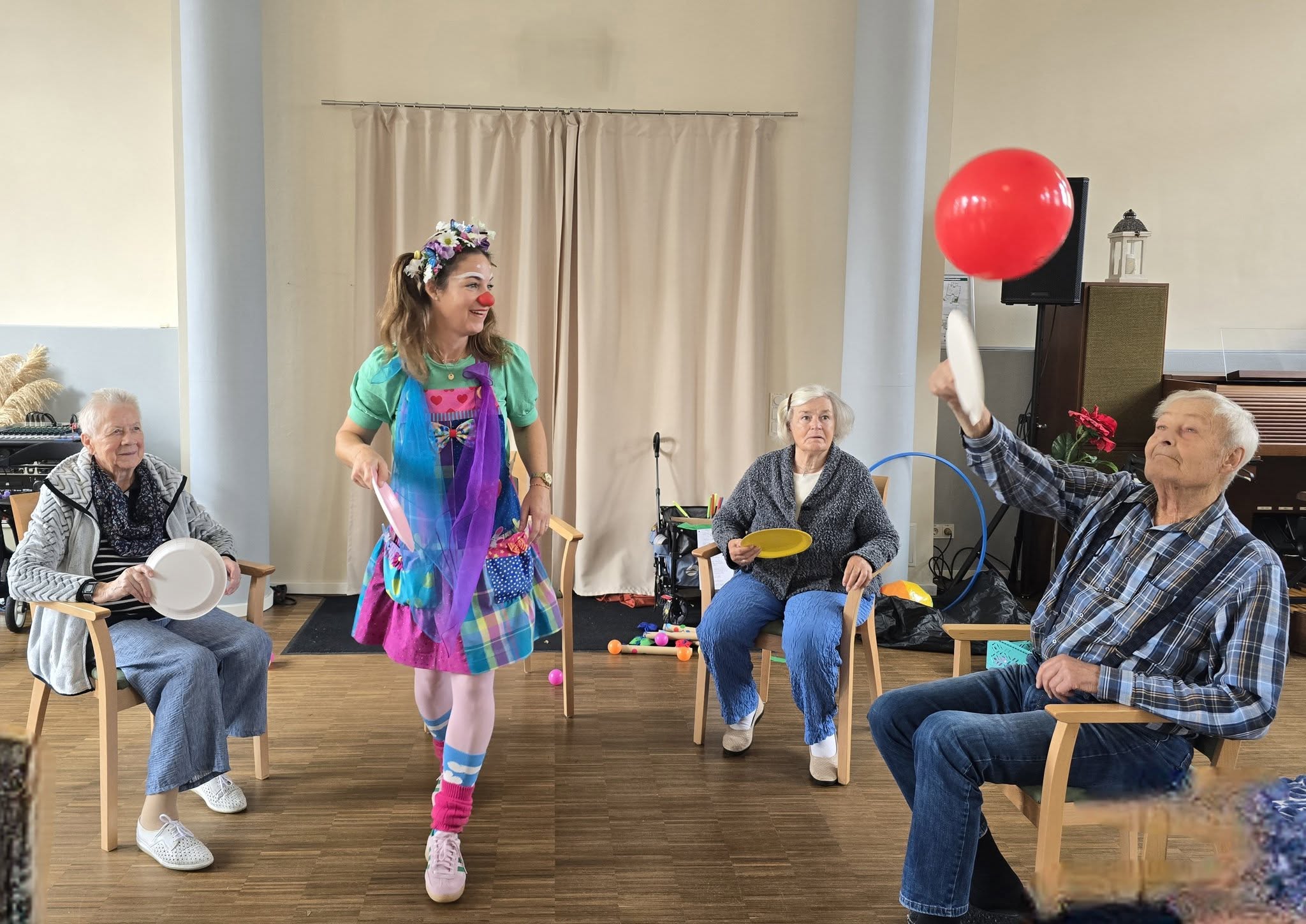 Projekt „Alt & Jung 2025 – Clownastik im Wöllner-Stift“ Drei Monate lang – von Anfang September bis Ende November – besuchte uns wöchentlich unsere Clownin Karla Konfetti, um mit uns einen heiteren Vormittag mit Spiel, Bewegung und vor allem Spaß zu verbringen.